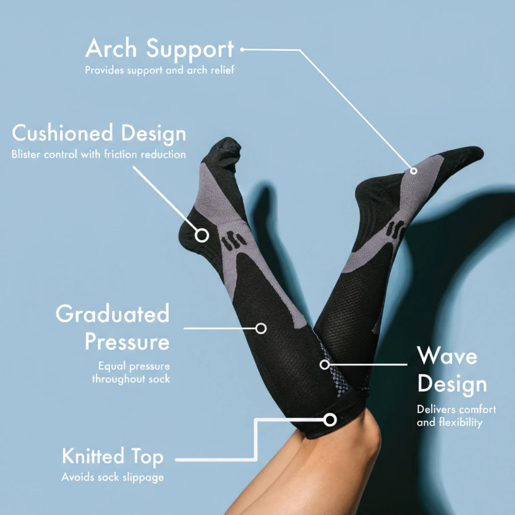 Your Comp Tech Socks will feel tight but just right. Infused with powerful anti-microbial properties, our socks are highly breathable and go to work immediately so you can say goodbye to heavy legs and hello to all-day energy!